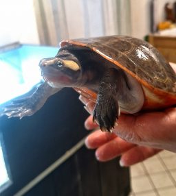 Beschreibung: Heribert ist eine Rotbauch-Spitzkopf-Schildkröte im Alter von sechs Jahren. Diese Art gehört zu den schönsten Wasserschildkröten. Aufgrund ihrer Wassertemperatur-Bedürfnisse sollte sie in unseren Gefilden nicht im Freien leben. Da sie sehr aktiv und schwimmfreudig ist, wird eine Beckengröße von mindestens 150x60x60 mit hohem Wasserstand empfohlen, um den Anforderungen dieser Schildkröte gerecht zu werden. Dabei sollte das Becken sowohl einen Wasserbereich als auch einen Landbereich mit UVB Lampe bieten. Auch sauberes Wasser ist für diese Wasserschildkröte sehr wichtig, daher muss das Wasser etwa alle zwei Wochen erneuert und ein Außen- sowie Innenfilter benutzt werden.